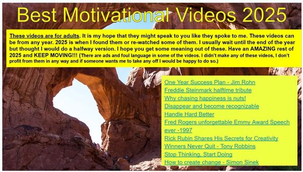Everyday I listen to motivational videos on my walks. Since 2022 I have been sharing the videos that have moved me in some way at the end of the year. This year I thought I would release the videos that I have listened to so far at the half way point. There is even a link to the videos from the past three years as well. I hope you enjoy - https://docs.google.com/presentation/d/1f2EFBTde7vu9OPC7QYtDxTI1msfRvpphVYG1CBwBXqc/edit?usp=sharing