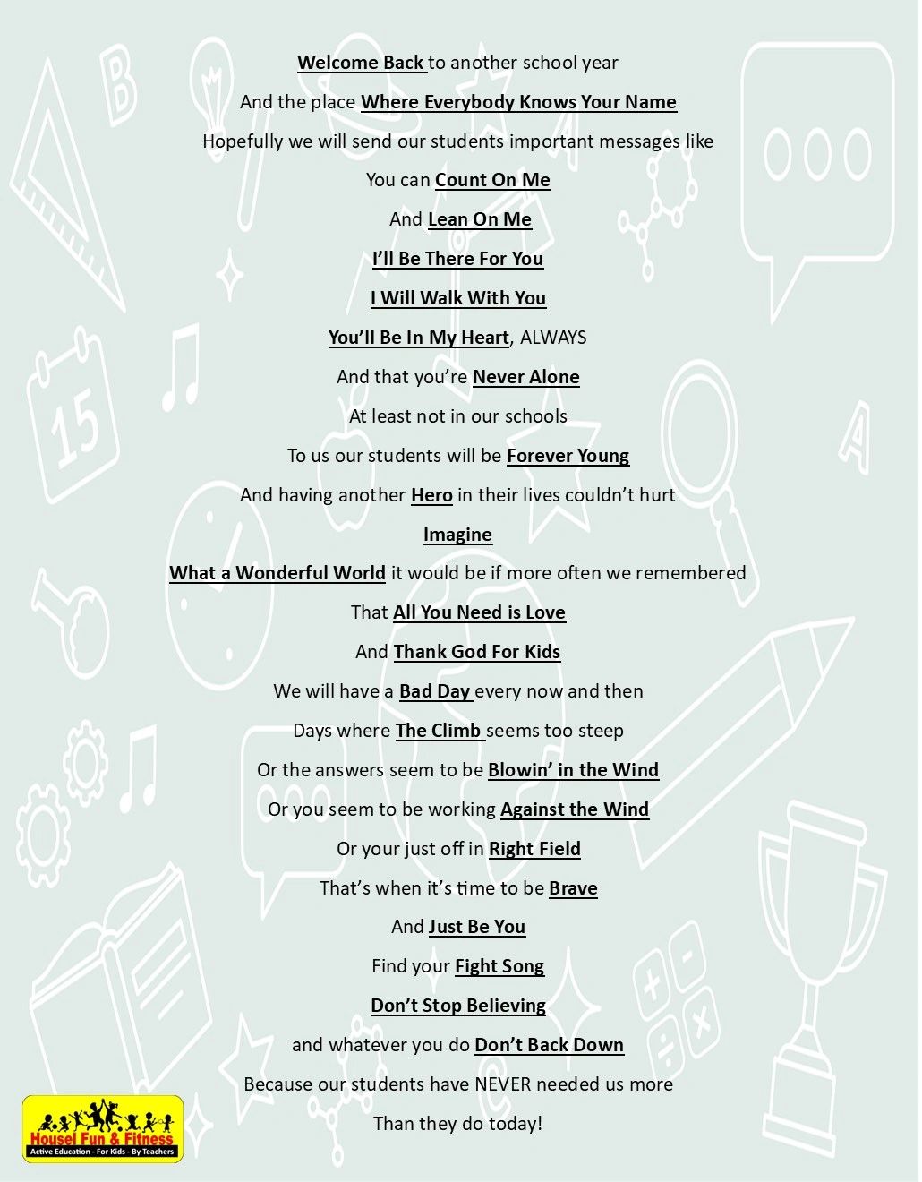 We made a video and wrote a poem made of song titles from our teacher inspiration playlist. Here is a link to the playlist - https://houselfitness.com/our-resources#7efe0207-9887-4b07-ad0b-b0caf9cd5576